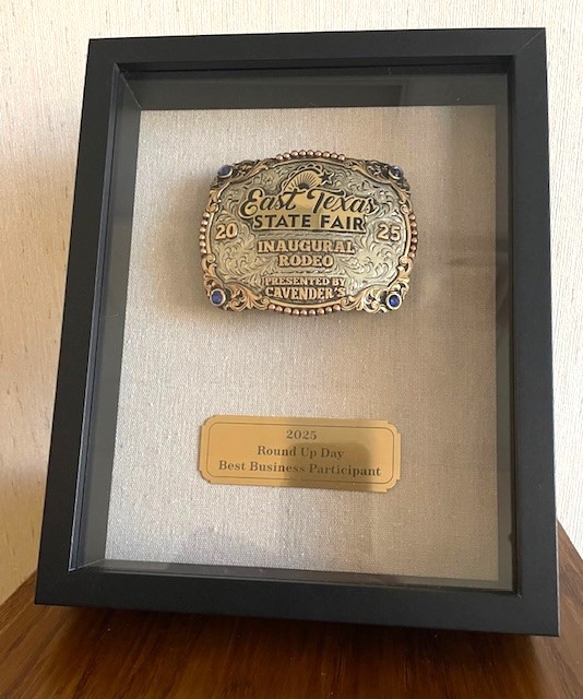 David Dial, co-chair of the East Texas State Fair’s Rodeo Committee, presented the Smith County Commissioners Court on Tuesday, October 7, with a custom belt buckle for winning the Round Up Day – Best Business Participant Award.