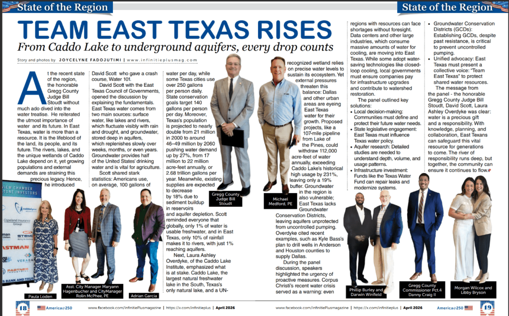 The message from the panel – the honorable Gregg County Judge Bill Stoudt, David Scott, Laura Ashley Overdyke was clear: water is a precious gift and a responsibility. With knowledge, planning, and collaboration, East Texans can safeguard this vital resource for generations to come. The river of responsibility runs deep, but together, the community can ensure it continues to flow.