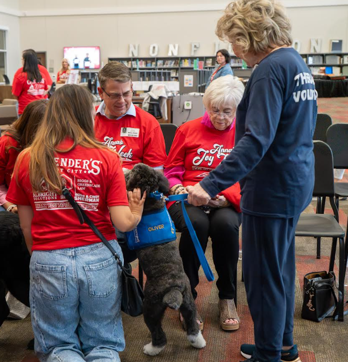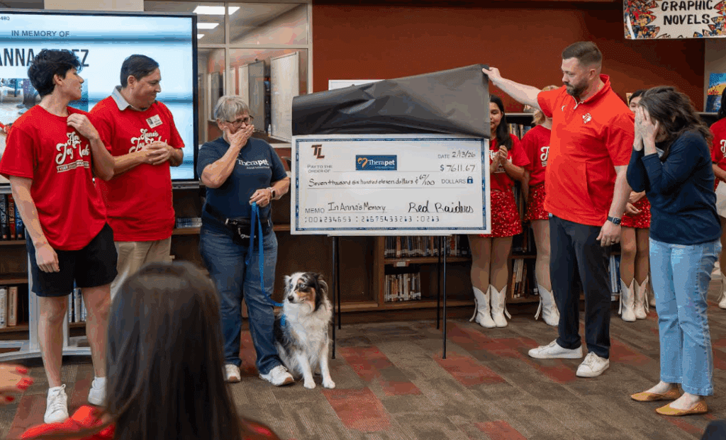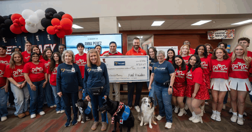 In honor of Anna’s love for dogs and her caring spirit, the Tyler Legacy community raised funds throughout the week to benefit Therapet. Principal Geoffrey Sherman recognized the collective effort and announced the total funds raised was $7611.67, before presenting a donation check to Therapet representatives.